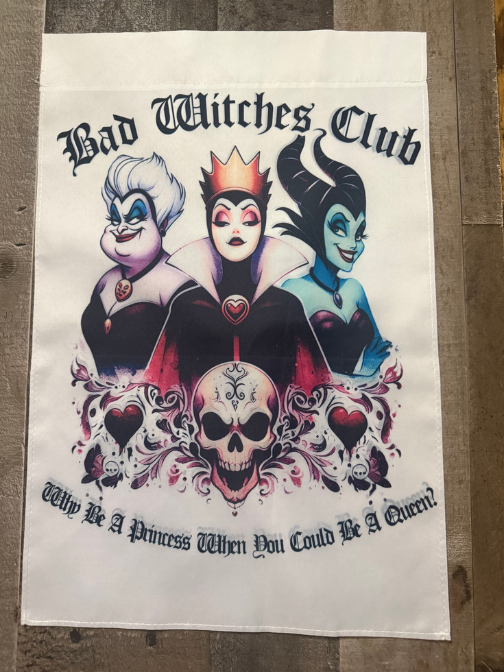 Ditch the tiaras and join the dark side with this bold design celebrating the ultimate queens of mischief. Featuring three iconic villainous witches surrounded by gothic skull and heart motifs, this piece embraces power, attitude, and a hint of wicked charm. The statement “Why be a princess when you could be a queen?” adds the perfect rebellious touch for anyone ready to rule their own fairy tale.
