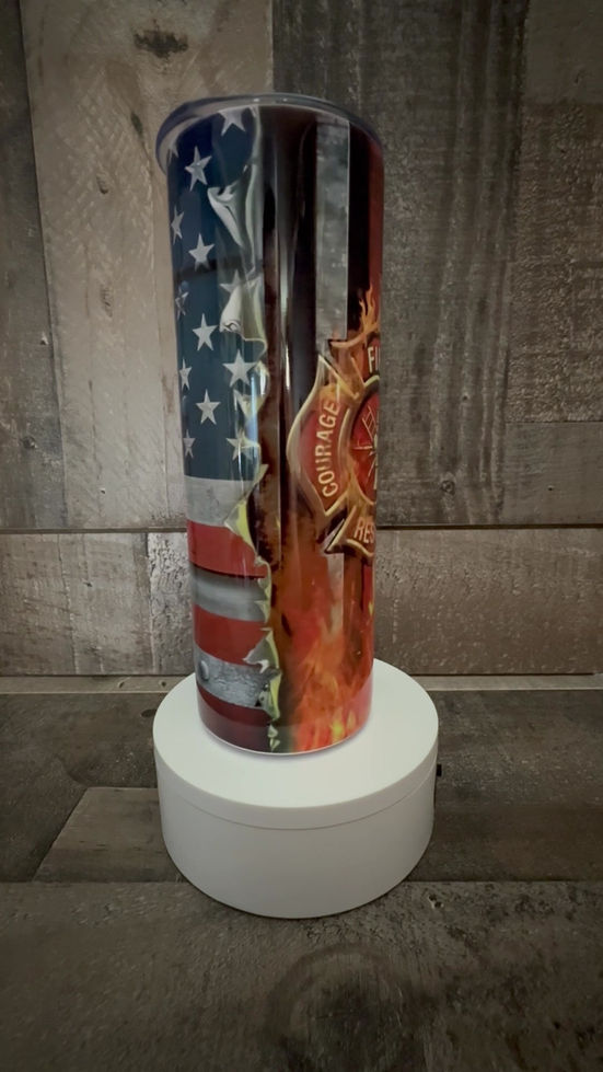 This bold piece features a firefighter emblem surrounded by fierce flames, layered over a distressed American flag backdrop. A striking tribute that symbolizes bravery, honor, and resilience — perfect for those who serve or anyone proud to support them.