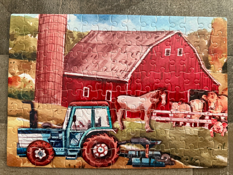 Step into the heart of countryside charm with this delightful scene, showcasing a classic red barn, weathered silo, and a vibrant farmyard full of life. A loyal horse stands by, while sheep, cows, and a playful pig peek over the fence, adding warmth and whimsy. The trusty blue tractor completes this pastoral setting, evoking the serenity and hardworking spirit of farm life.