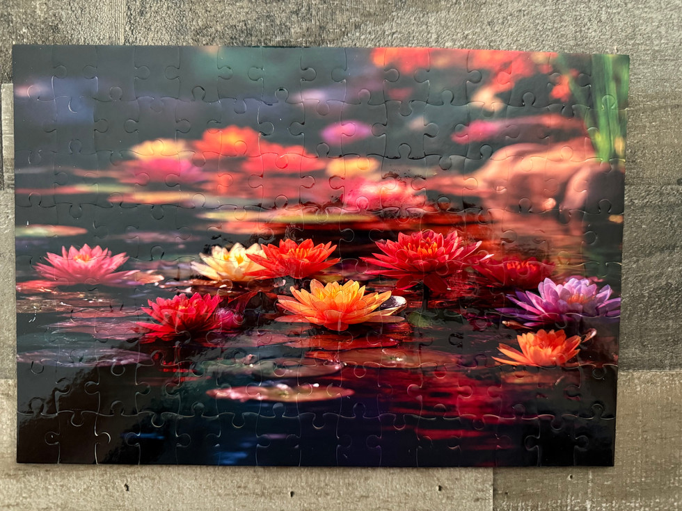 A serene arrangement of colorful water lilies drifting on a tranquil pond, reflecting the surrounding garden’s vibrant hues. The mix of pink, yellow, orange, and lavender petals creates a soothing yet lively display, evoking peace and renewal.