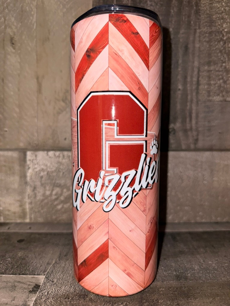 Show off your Griz pride with a bold twist! This fan-inspired design features a striking chevron wood pattern backdrop that frames the iconic Grizzly spirit in standout red and white. Perfect for game days, tailgates, or everyday use, this piece keeps your Big Sip Energy flowing strong.