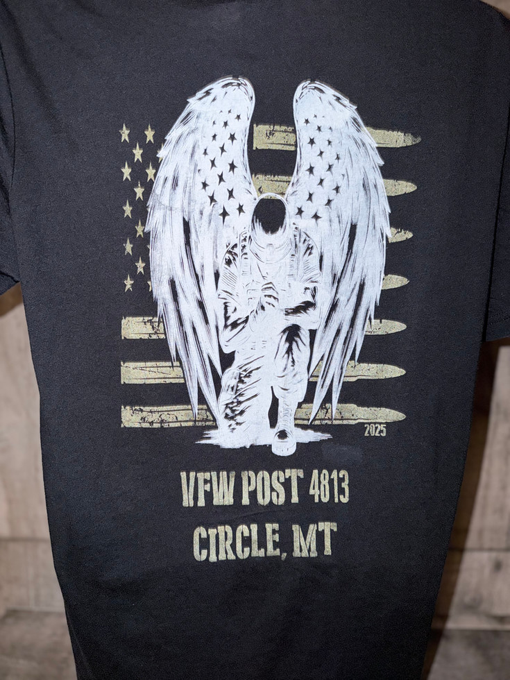 This design honors those who serve and the ones who never stop carrying the weight of sacrifice. Guardian of the Fallen features a kneeling soldier with powerful wings set against a distressed American flag made of bullets, creating a tribute filled with pride, strength, and reverence. Perfect for Veterans of Foreign Wars supporters, patriotic events, and anyone who stands with the heroes of VFW Post 4813 in Circle, Montana. Bold, striking, and crafted to honor real courage.