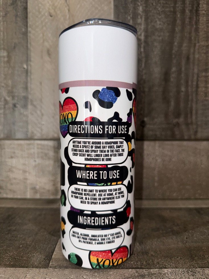 Unapologetically bold and proudly loud, Homophobe Repellent is the tumbler that says what we’re all thinking. Wrapped in a playful cow print with rainbow hearts and glitter-style accents, this design brings humor and truth together in one fierce statement piece. The back features tongue-in-cheek “directions,” “ingredients,” and “usage” for spraying away hate—because sometimes, all it takes is a little pride and zero patience. For those who live loud, love louder, and take no crap from bigots.