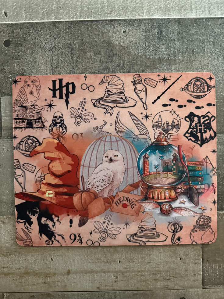 Step into a world of spells and adventure with the Magical Messenger mousepad. Featuring enchanting illustrations inspired by beloved wizarding tales—like an iconic snowy owl, mystical sorting hat, and magical artifacts—this design captures the wonder of the wizarding world.
