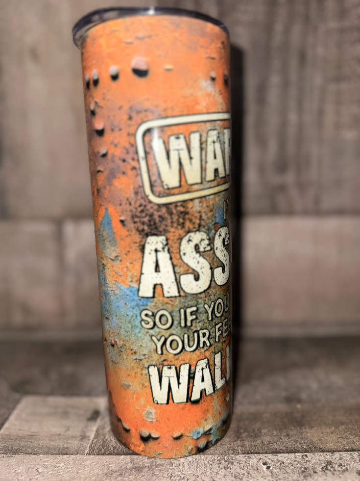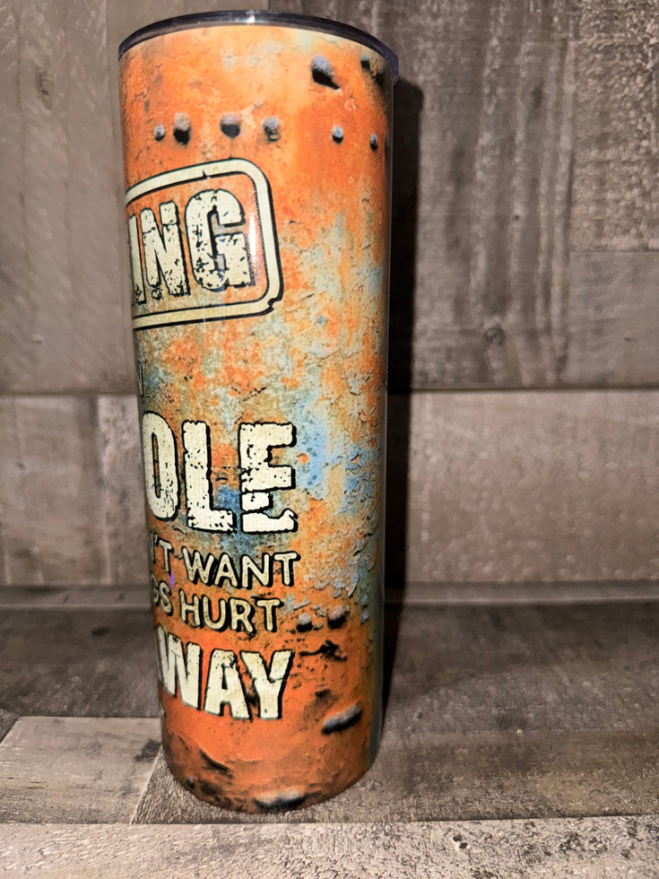 With its weathered metal look and distressed orange-blue finish, it screams attitude while keeping your drink perfectly chilled or hot. Featuring the statement “WARNING: I’m an Asshole – so if you don’t want your feelings hurt, walk away,” this piece is a mix of rustic grit and savage humor. Perfect for anyone who embraces their raw personality with pride.