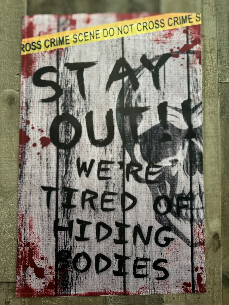 The Final Warning delivers a chillingly playful message for those who don’t take hints. Styled with bold, blood-spattered lettering, faux crime scene tape, and a weathered wood background,