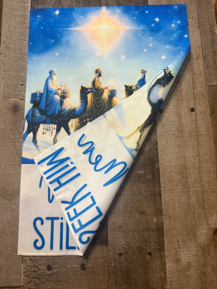 Featuring the iconic three wise men traveling beneath the brilliant Bethlehem star, this serene design reminds us of the enduring search for faith and light during the holiday season.